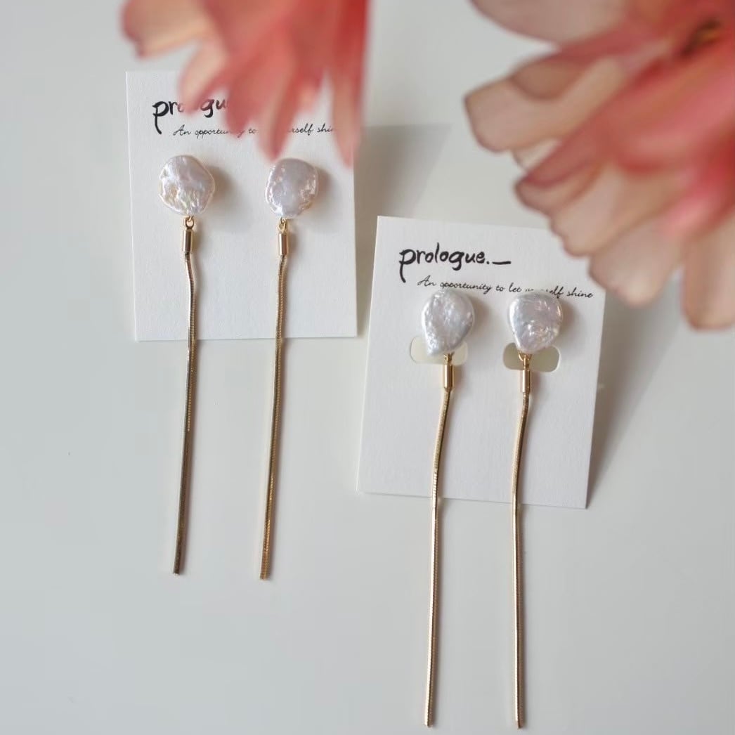 淡水パールの柔らかな光と、すっと伸びたゴールドラインが美しいシンプルで洗練されたデザインのアクセサリー。